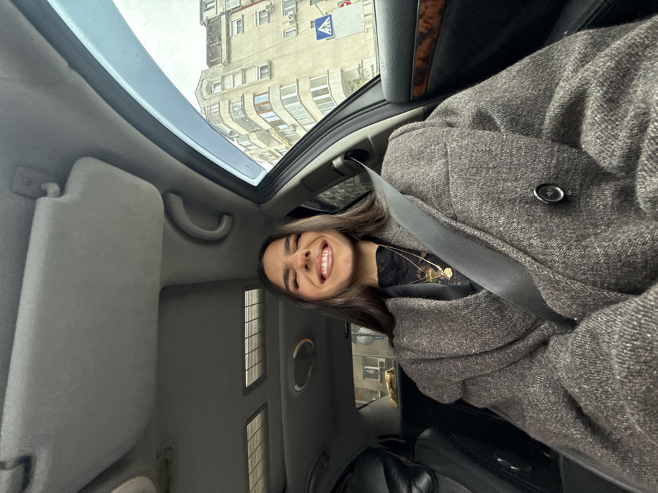 A young adult female is depicted from the mid-chest up, seated in the passenger seat of a vehicle, facing the camera