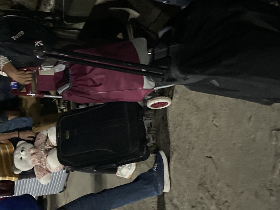 An overhead shot displays luggage, including a black suitcase, a pink and white carrier, and a black backpack, resting on concrete. A stuffed teddy bear with pink pajamas and a person's legs clad in jeans and blue sneakers are also visible. A portion of a black stroller and a hand holding part of the carrier can be seen. The overall composition is somewhat cluttered and suggests a waiting area or travel scene.