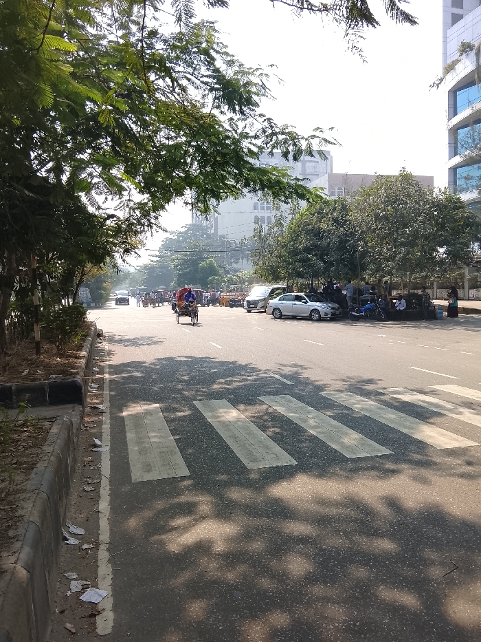A street scene shows a zebra crossing in the foreground, marked on an asphalt road. Trees line the side of the road, casting shadows on the pavement. In the distance, cars and a rickshaw are visible. Further back, people gather near parked vehicles under the shade of trees. Buildings are visible in the background, indicating an urban setting under a bright, slightly hazy sky.