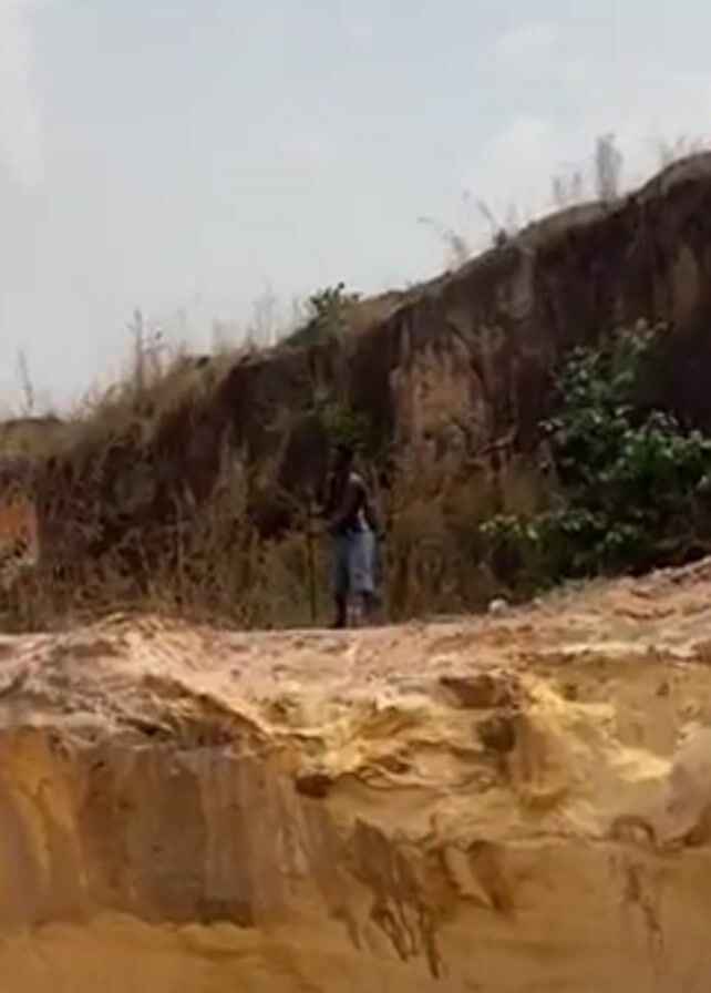The video depicts a man standing on the edge of a sandy cliff. He is wearing a dark tank top and light blue shorts. He is holding a long stick in his hands and appears to be looking around or gesturing with it. The cliff face is a mix of yellow and orange-hued sand, and there is some sparse vegetation on top of it. In the background, there is a taller cliff covered with more dense vegetation. Another person is visible partially hidden behind the vegetation on the cliff. The sky is overcast.