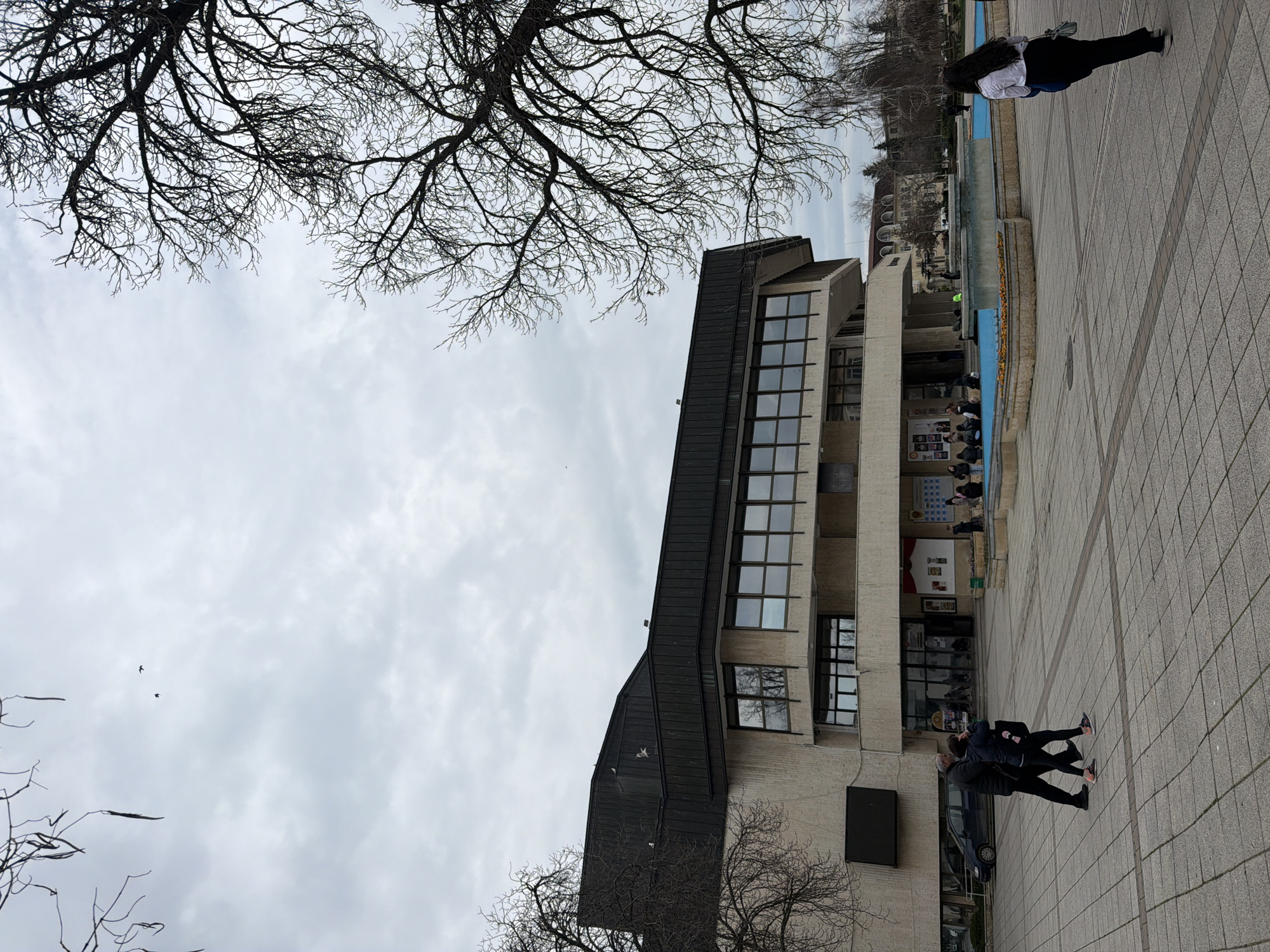 The image depicts an overcast daytime scene at Vazrazhdane Square in Razgrad, Bulgaria. The central focus is the Общински културен център - Драматичен театър Разград (Municipal Cultural Center - Drama Theatre Razgrad), a multi-story modernist building with a light-colored facade and a dark, angled roof structure. Several rectangular windows are visible on the upper and mid-levels, reflecting the sky. Two seagulls are perched on the dark roof, and multiple posters or notices are affixed to the facade near the ground-level glass entrance doors. A dark, rectangular sign is mounted on the upper left section of the building's exterior. The foreground consists of a large public square paved with gray square and rectangular tiles. To the right of the center, a large, multi-tiered fountain structure is present, its interior basins painted blue and appearing empty of water. Flower beds containing small orange flowers surround parts of the fountain. Three distinct groups of individuals are present: 1. In the foreground-left, a male and a female are walking from left to right across the paved square. The male wears a dark jacket and pants, while the female wears a dark jacket, dark leggings, and sneakers with pink accents, carrying a dark bag. 2. Near the building entrance and fountain, a group of approximately 5-7 individuals are gathered, some seated, others standing. One individual among them wears a bright yellow or green garment. 3. In the foreground-right, a female with long dark hair, wearing a white long-sleeved shirt, dark pants, and light-colored sneakers, walks away from the camera, carrying a light blue shoulder bag. The environment includes several deciduous trees, completely bare of leaves, indicating a late winter or early spring setting. A large, bare tree branch occupies the upper right portion of the frame, with smaller branches in the upper left. The sky is uniformly overcast, and two birds are visible flying in the upper sky. A dark-colored sedan or minivan is parked near the building on the far left.