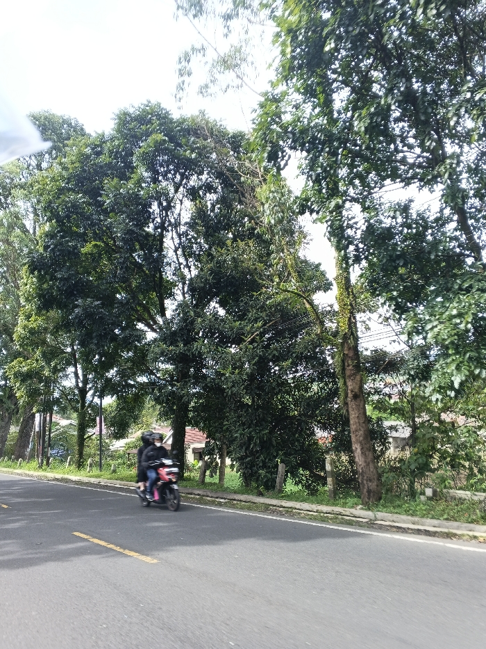 A paved road stretches into the distance with a yellow stripe marking its lane. A red scooter carries two people, both wearing black jackets and helmets. Lush green trees line the roadside, their leaves full and creating a dense canopy overhead. Behind the trees are glimpses of houses and utility poles. The sky is overcast.