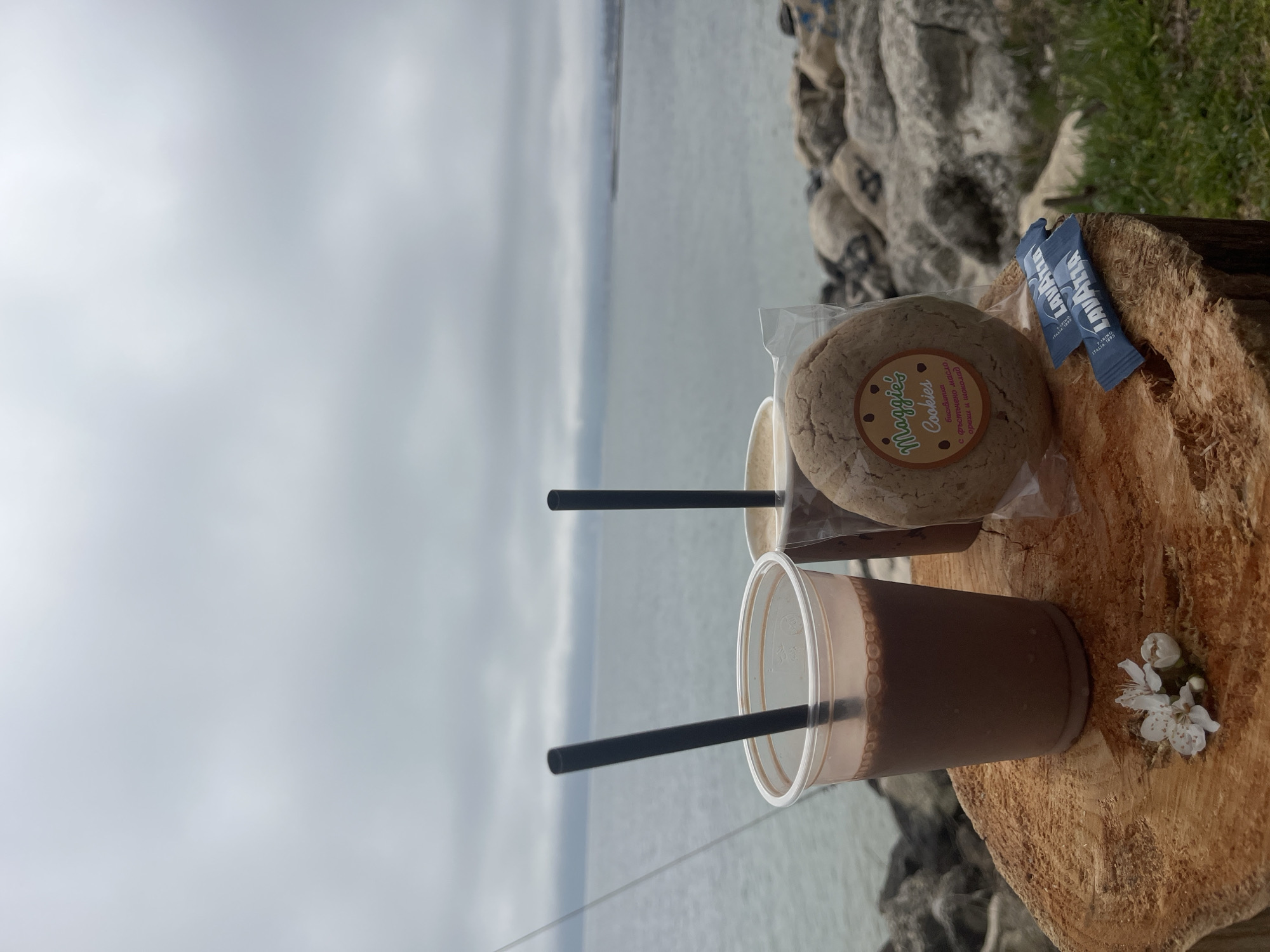 The image displays an outdoor, coastal scene at the Black Sea in Varna, Bulgaria, under an overcast sky. In the foreground, a weathered, circular tree stump serves as a surface. Arranged on the stump are: a clear plastic cup containing a dark brown liquid with a black straw; a cluster of small white blossoms with pink centers; a second, partially obscured clear plastic cup with a lighter brown liquid and a black straw; a large, round cookie, individually sealed in a clear plastic bag, featuring a "Maggie's Cookies" label that includes Bulgarian text specifying ingredients (peanut butter, walnuts, and chocolate); and two stacked blue foil packets, each marked "LAVAZZA". Behind these items, the calm, grey expanse of the Black Sea extends to a distant horizon where faint land or structures are visible on the right. A rocky shoreline is present between the tree stump and the water. The sky is uniformly grey with heavy cloud cover. No individuals are visible.