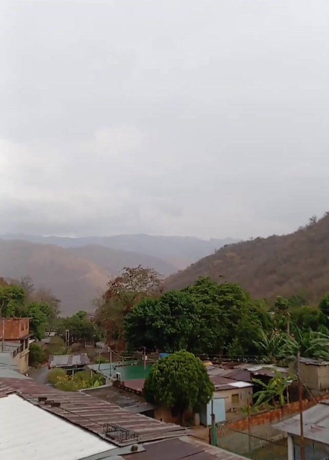 n overcast landscape. In the foreground are the rooftops of buildings, mostly covered with rusty corrugated metal. Beyond the buildings, there are lush green trees and vegetation. In the background, rolling hills fade into a hazy distance under a gray sky. The camera pans slightly to the right, focusing on one of the hills, revealing its sparse vegetation and steep slope. Overall, the scene depicts a rural area, possibly a small town nestled in a mountainous region.