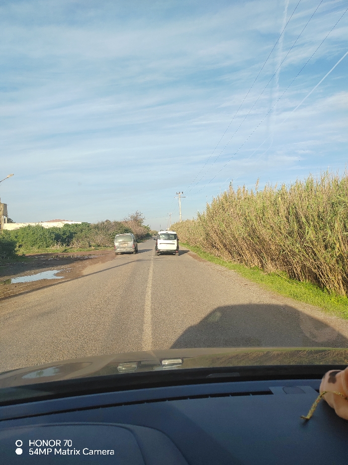 A road stretches into the distance, flanked by tall reeds on the right and lower vegetation on the left. Two vehicles, a white van and a silver car, are driving ahead. Power lines crisscross the sky above. The image is taken from inside a car, capturing the dashboard and a blurred shadow of the vehicle. The sky is a light blue with scattered clouds.