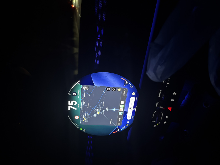 The image depicts the interior of a vehicle at night, focused on its illuminated digital dashboard and center console
