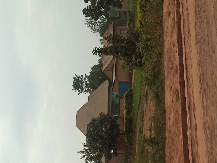 Two simple houses with brown roofs and tan walls peek through trees and shrubbery. One house has a blue door or window. A green lawn surrounds the houses. A dirt path runs vertically on the right, possibly a road. The sky is overcast and a pale gray. The scene appears rural.