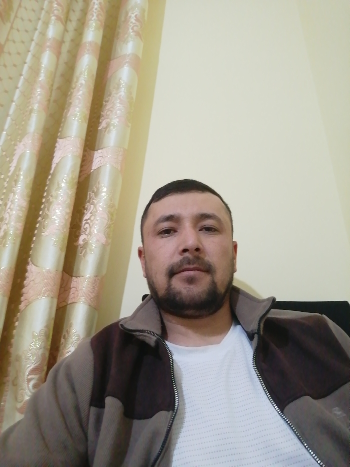 An adult male is centrally positioned in a close-up indoor portrait. He has short dark hair, a trimmed dark beard, and a mustache. He is looking directly at the camera with a neutral expression. He wears a two-tone zippered jacket, with the upper portion (shoulders and top of sleeves) in dark brown and the lower portion in light brown or tan. Beneath the jacket, a white t-shirt with a subtle textured pattern is visible. The background consists of patterned curtains on the left, featuring cream and light pink/peach tones with ornate designs, and a plain, light cream or pale yellow wall on the right. The scene is located in an indoor setting in Samarkand, Uzbekistan.