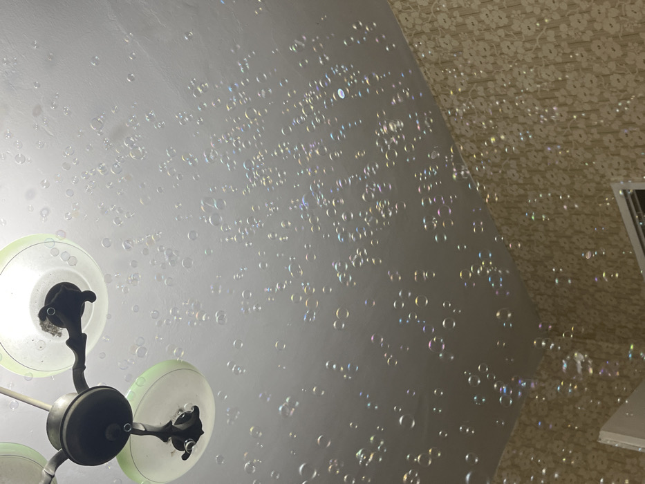 The image depicts an interior room, presumed to be in Varna, Bulgaria, though the precise location within the city is not discernible. Numerous translucent, iridescent soap bubbles of various sizes are suspended throughout the air, reflecting ambient light. In the upper left quadrant, a metallic three-armed chandelier is mounted on a plain white ceiling, with two light fixtures visible. Each fixture features a green-tinted translucent glass shade; visible dust and debris are present within the upward-facing shade of the uppermost fixture. The ceiling appears uniformly white. The upper right and lower right portions of the frame reveal a wall covered in light-colored wallpaper with a repeating floral or geometric pattern in beige and brown tones. A narrow section of a white door or window frame is visible along the bottom edge of the image. No individuals are present in the scene. The primary action inferred is the generation and dispersal of the bubbles within the enclosed space.