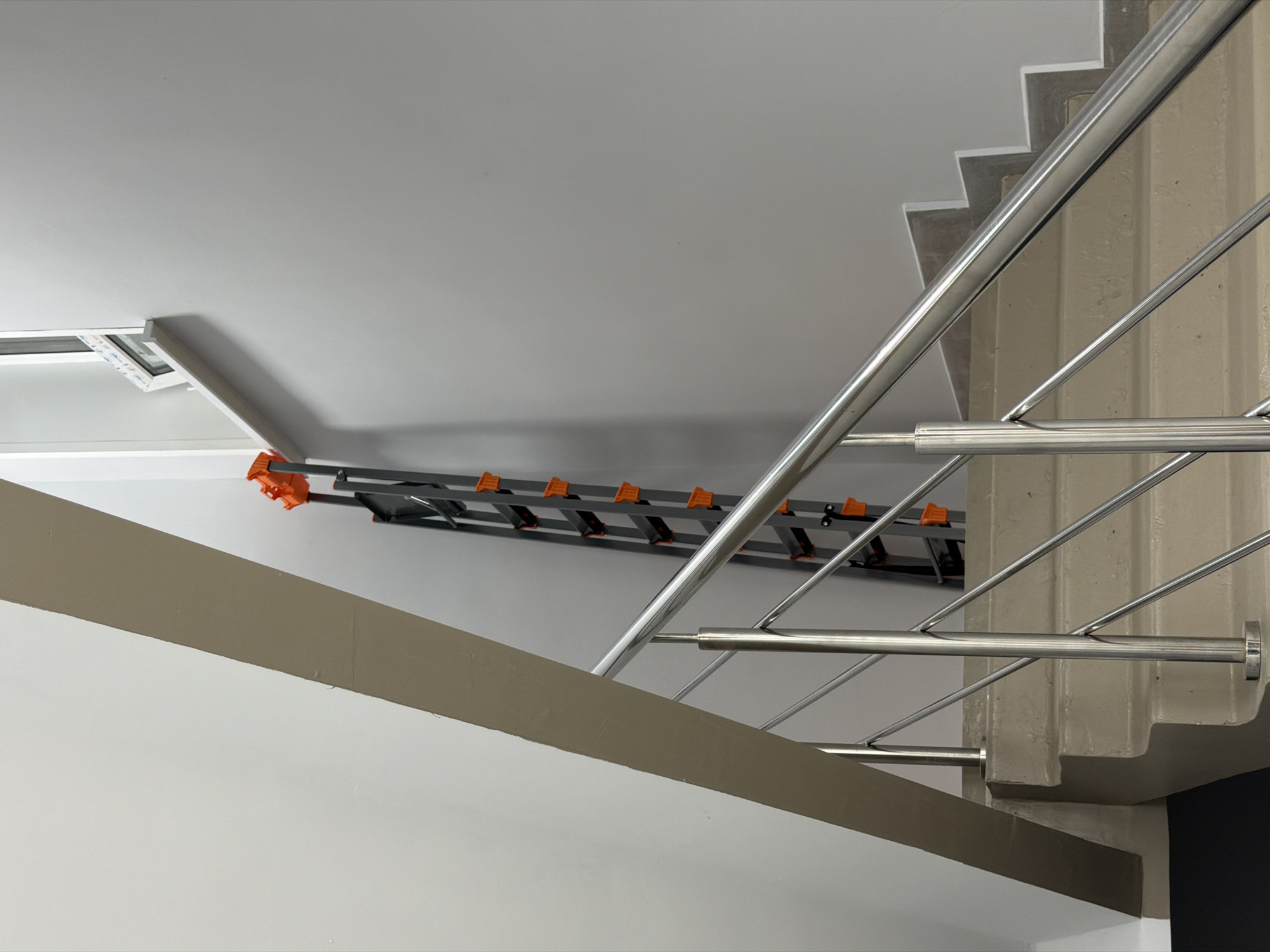 view of an indoor stairwell. A modern stainless steel railing runs along the right side of the frame, with the concrete stair structure visible behind it. The steps are light gray. Above and to the left, a folded ladder with orange safety locks is mounted against a white wall and ceiling. A grey structural support beam runs diagonally across the lower left of the frame. A small window is located in the upper left corner of the ceiling. The location appears to be an interior space in Sarapul, Russia.