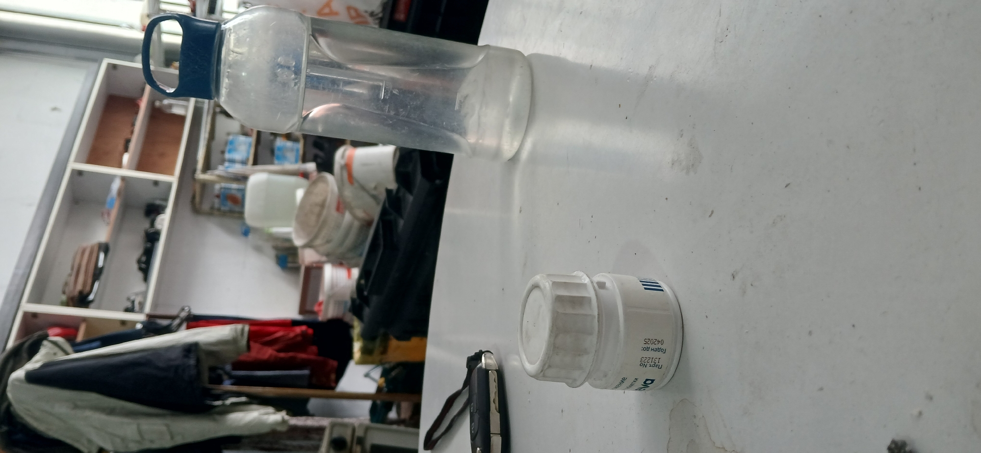 The scene depicts an interior space, likely a workshop or storage area, with a focus on a white table surface in the foreground. No specific identifying markers are present to confirm the location within Sliven, Bulgaria. On the white, slightly stained table, a black car key fob with silver accents and a black strap is positioned on the left. To its right, a small, white plastic container with a ribbed screw cap is visible. Its label indicates "Part. No 131223" and "Годен до: 042025" (Expiry Date: 04/2025), with "Eva" partially visible as a brand. Further to the right, a clear plastic water bottle with a blue handle integrated into its cap stands upright, containing a clear liquid. The bottle shows volume markings. The background reveals a cluttered indoor environment. On the left, several articles of clothing, including light-colored and red garments, hang on a vertical support. Above these, white open shelves against a light wall hold various items, including footwear and other objects. In the midground, to the right of the hanging clothes, multiple white buckets, some appearing to contain bulk material, are stacked. A large, translucent white plastic container is visible behind the buckets. A black rectangular object, possibly a case, rests on a lower surface. The overall lighting suggests an interior space with ambient illumination. No individuals are present, and no actions or interactions are depicted.