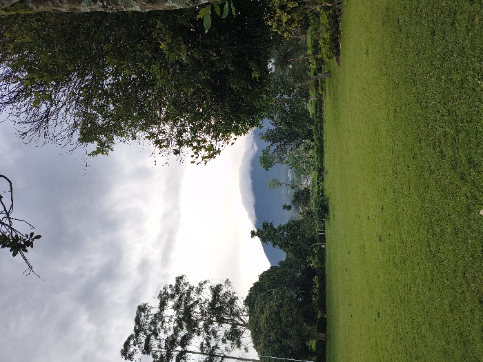 A wide-angle landscape photograph captures a verdant, well-maintained grassy lawn occupying the lower half of the frame. A diverse tree line forms the midground, featuring tall, slender trees with sparse foliage on the left, a dense, round-canopied tree centrally, and part of a large tree trunk with lighter-colored bark prominent on the far right. In the background, a mountain peak is partially shrouded in white clouds or mist, with indistinct building outlines visible through the trees below, indicating a distant settlement. The sky above is overcast with varying shades of grey clouds, displaying some wispy formations. No individuals, animals, or active events are present within the scene. The specific location within Unknown, Vietnam is not visually identifiable, but the environment is consistent with a mountainous or hilly region.