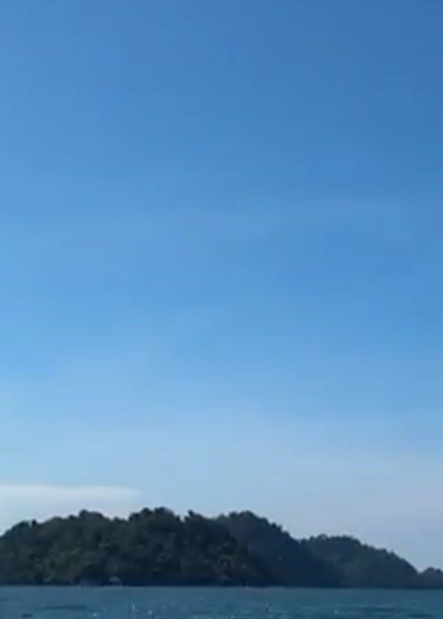 landscape scene from the perspective of a boat on the ocean. The camera appears to be moving along the water, showing a small, verdant island on the horizon. The island is densely covered with trees and appears rocky near the shore. The ocean is a deep blue with visible white wakes from the boat's movement. The sky is a clear, bright blue with no visible clouds. The overall scene is bright and suggests a sunny day.