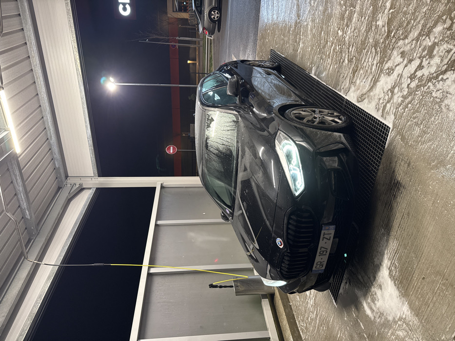 A black BMW sits partially on a metal grate within an automated car wash
