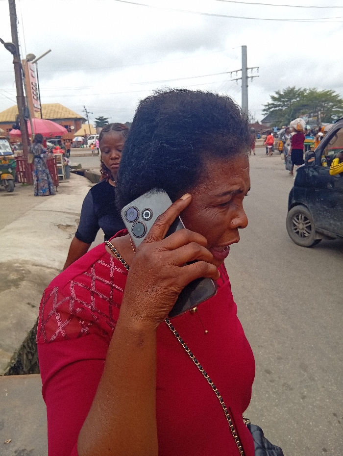 The image presents an outdoor street scene in Ura Nta Umuarandu, Nigeria, under an overcast sky. In the immediate foreground, a dark-skinned woman with dark, textured hair is captured in profile, speaking into a dark smartphone featuring a triple-lens camera system held to her right ear. She wears a solid red top with patterned sheer fabric on the shoulders and a gold-colored chain strap from a bag across her torso. Her mouth is slightly open as if mid-sentence. Behind her, a second dark-skinned woman with braided hair and a dark top is partially visible. The background depicts a busy street or market area. To the left, a yellow-accented auto-rickshaw is parked near a concrete drainage channel. Further back on the left, a utility pole with multiple wires and an attached sign is visible, along with people gathered near a red umbrella, suggesting a market stall. A building with a reddish-brown roof stands in the distance. To the right, a dark-colored vehicle is partially visible on the asphalt road, and numerous individuals are dispersed along the street, some appearing to carry items on their heads. Another utility pole with overhead wires is present on the right side of the background, with distant trees under the cloudy sky.