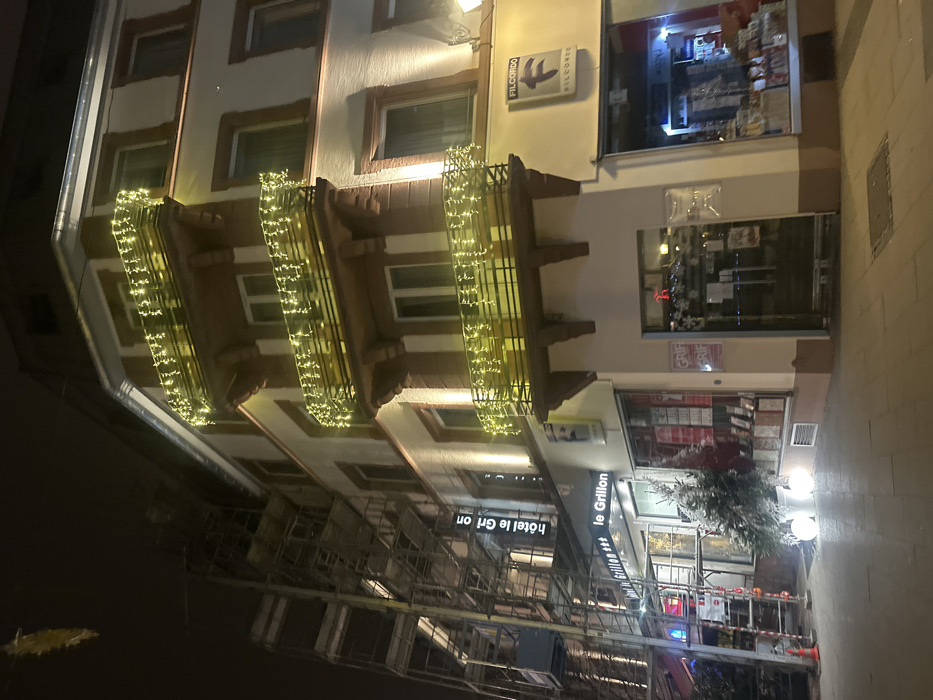 A three-story building adorned with strings of lights across each level's balcony. A sign for "Filcordo" is visible on the upper floor, adjacent to a storefront. Below, another shop is visible with Christmas decorations. Scaffolding obscures the lower portion of the building, where "Hotel le Grillon" signage is present. The scene is captured at night with a blurred background.