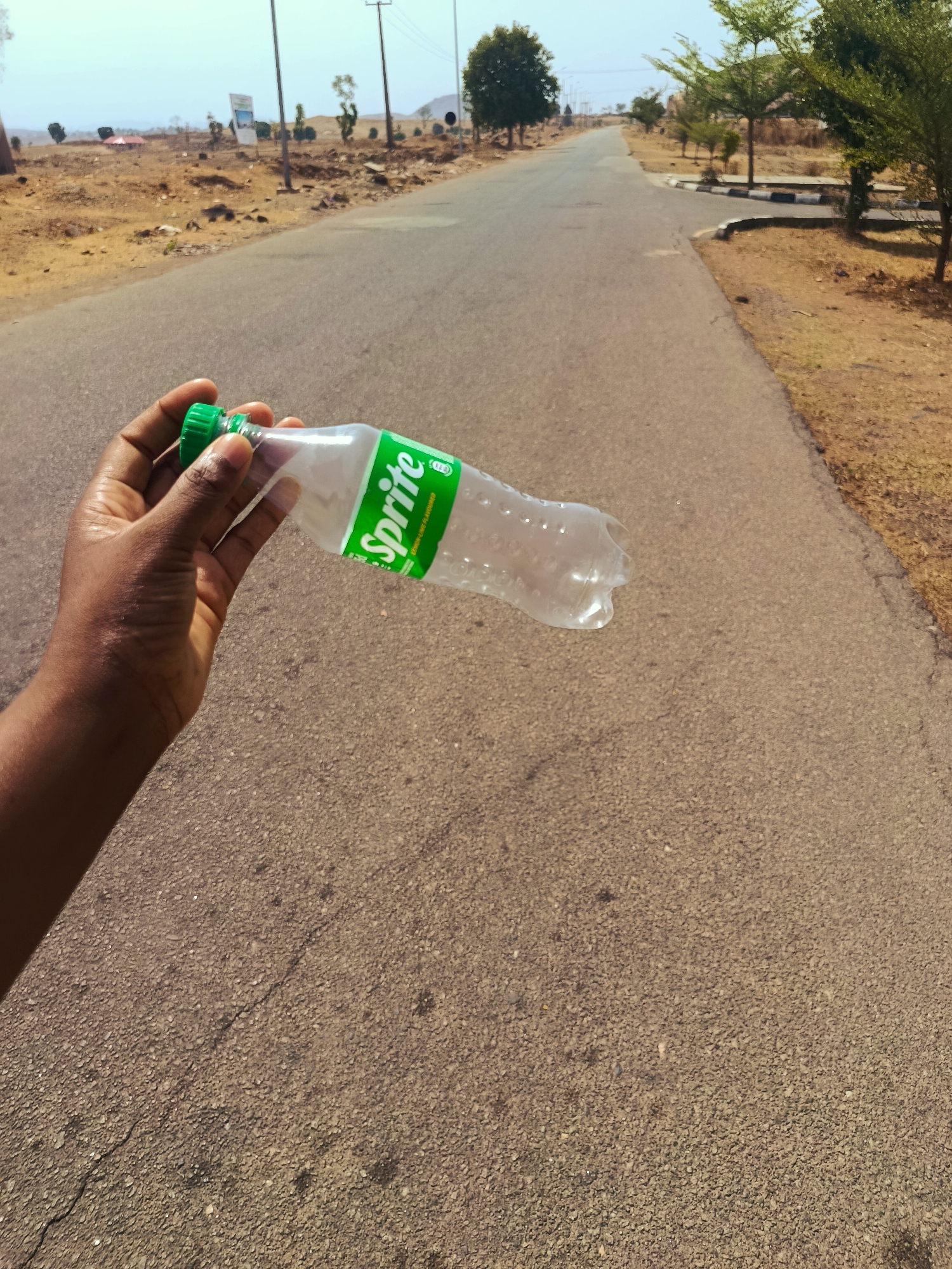 hand holding an empty Sprite bottle on a paved road. The location is in Rafin Pa, Nigeria, as evidenced by the typical vegetation and landscape. The road stretches into the distance, lined with trees and dry, grassy areas. There is some development visible in the background.