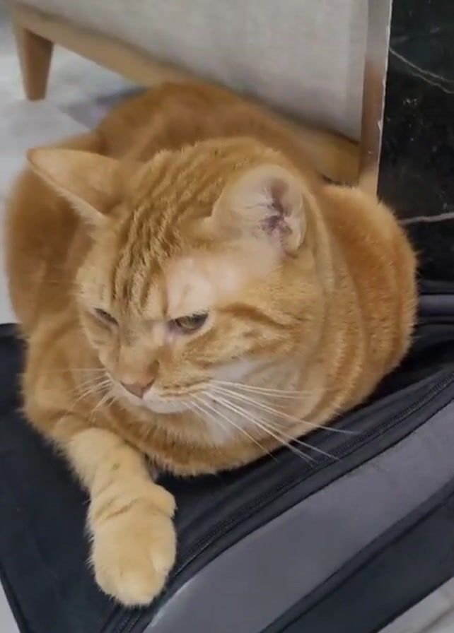 - "A tan tabby cat lies on top of a black and gray laptop bag that is resting on a white tile floor" by FM-lpZ3r2, licensed under CC BY 4.0