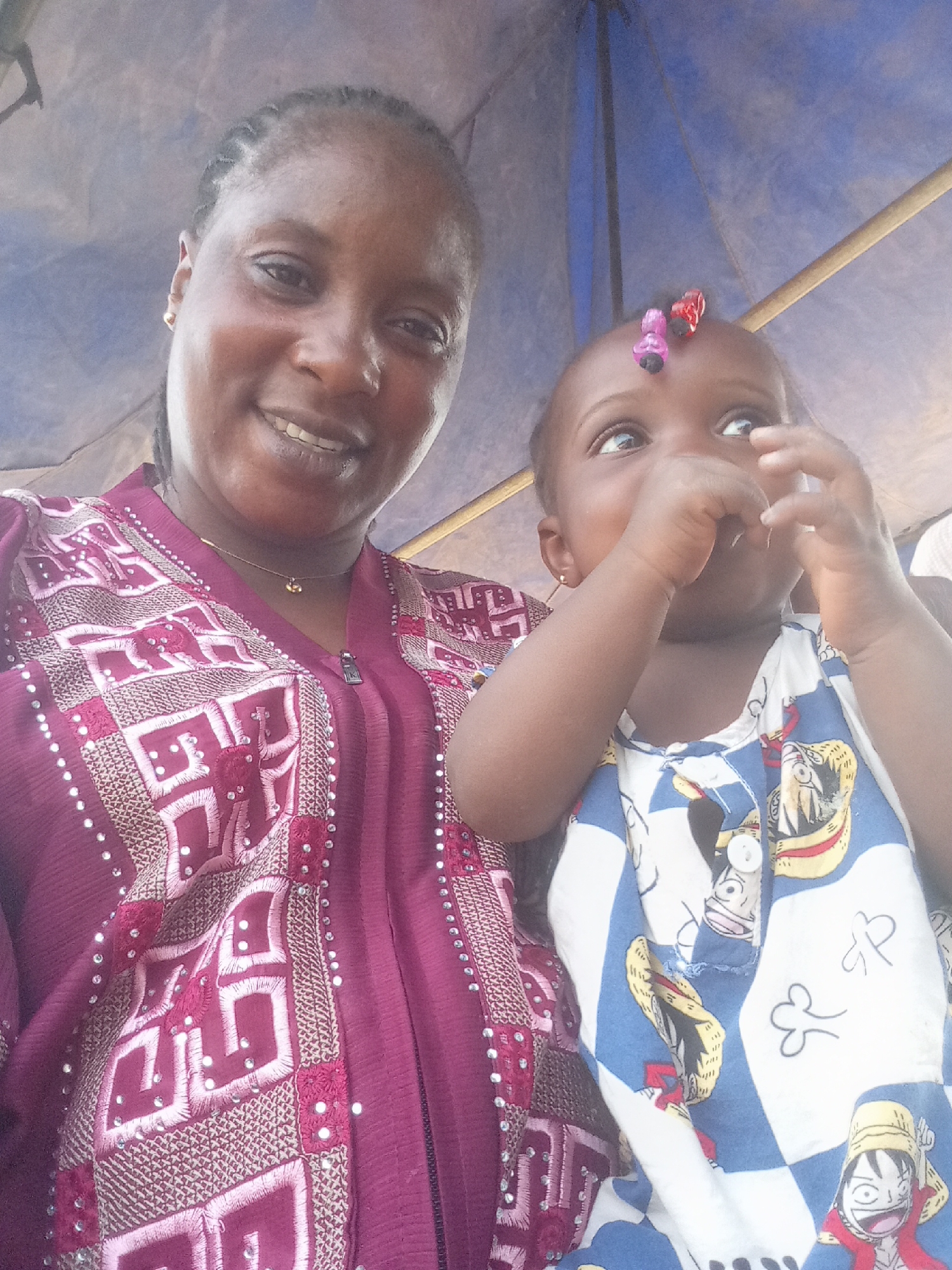 A medium, eye-level, full indoor shot depicts an adult woman and a baby together. The woman is light-skinned with dark braided hair, wearing a maroon patterned outfit with a zipper and a delicate gold necklace. She smiles into the camera. The baby, wearing a blue and white patterned top featuring cartoon characters, looks upward with their fingers near their mouth, and has colorful hair clips. The setting appears to be under a blue canopy or umbrella. The image was taken in Doma, Nigeria.