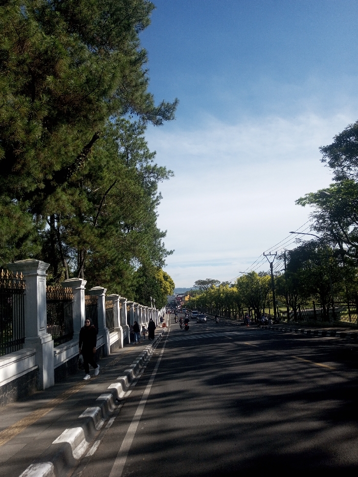 This image depicts a wide street or boulevard in Phonethan, Laos, under a partly cloudy sky. On the left, a paved pedestrian sidewalk runs parallel to a long, ornate fence composed of white pillars and black wrought iron panels with gold accents. Behind this fence stands a dense row of tall evergreen trees, casting long shadows across the sidewalk and the adjacent road. Several individuals are present on the sidewalk; in the foreground, a person wearing dark clothing and white sneakers walks away from the camera. The central feature is a two-lane asphalt road, marked with a continuous white center line, extending into the background. Moderate traffic, consisting of motorcycles and cars, is visible on the road, generally moving away from the viewer. A white, undulating concrete curb separates the sidewalk from the road on the left. On the right side of the road, a line of deciduous trees with green foliage creates a green buffer. Utility poles with overhead wires are spaced along this side. Further down the road, additional pedestrians are visible near the trees. The horizon reveals a faint, distant urban or semi-urban landscape beneath a sky that transitions from a deep blue overhead to a lighter, hazy blue with scattered wispy clouds.