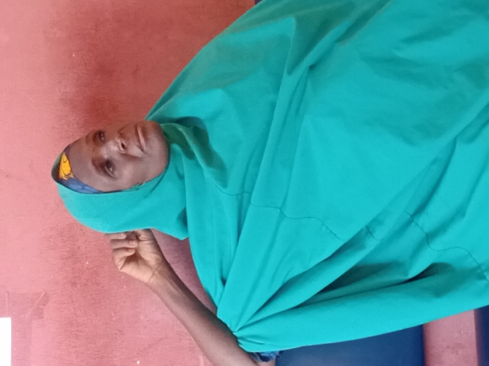 An indoor, waist-up image depicts an adult female with a darker skin tone, seated against a faded reddish-pink wall. She wears a teal-colored full-body draping garment that covers her head and much of her form. A blue and yellow patterned underlying headscarf is visible on her forehead. Her right arm is raised, with the hand positioned near her temple. Her gaze is directed upwards and to the right, away from the camera. A dark blue surface, likely a seat cushion, is partially visible on the lower left. The scene is located in the city of Unknown, Unknown.