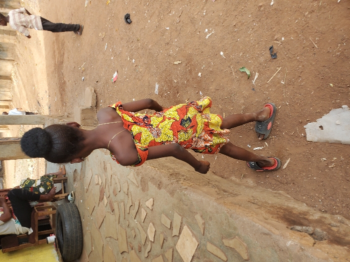 A young person in a colorful dress stands outside on a dirt ground, wearing sandals. The individual has their hair in a bun. An older man is standing a distance away. A wall featuring mosaic tiles runs along the bottom of the image, with a tire leaning against it. Another individual sits on a chair near the wall.