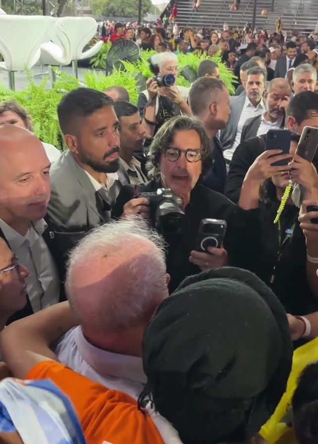 A tightly packed crowd surrounds a man with thinning white hair, who appears to be the focal point of the commotion