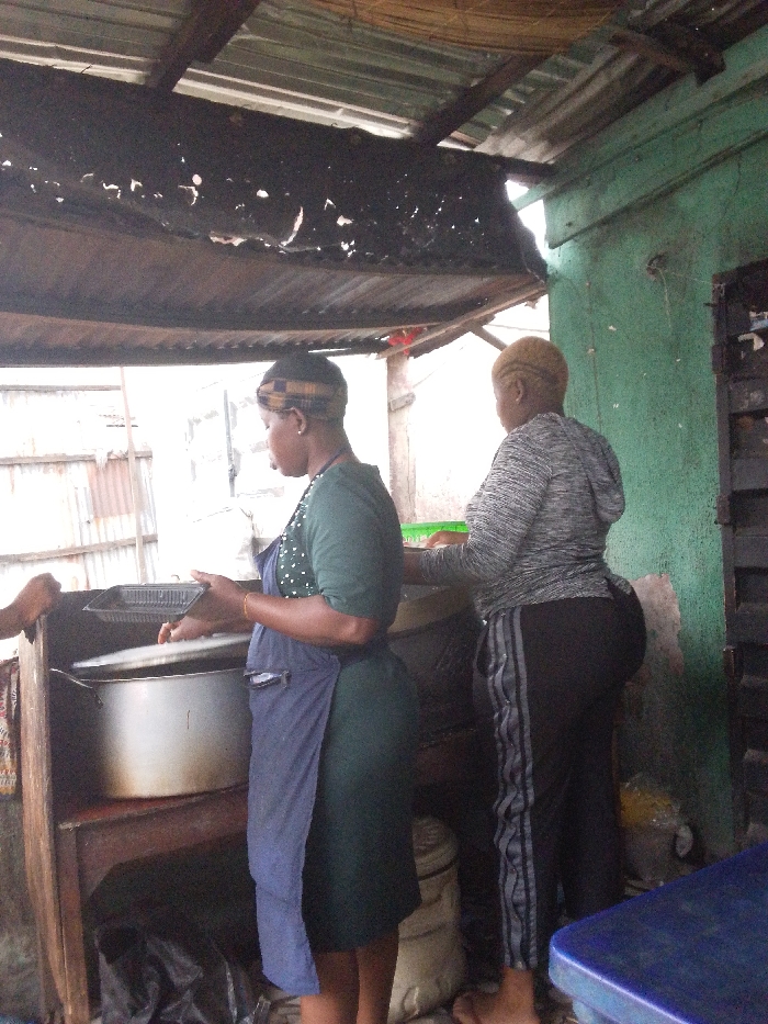 This image, taken in Alaiyabiagba, Nigeria, depicts a food preparation or service area within a semi-enclosed structure