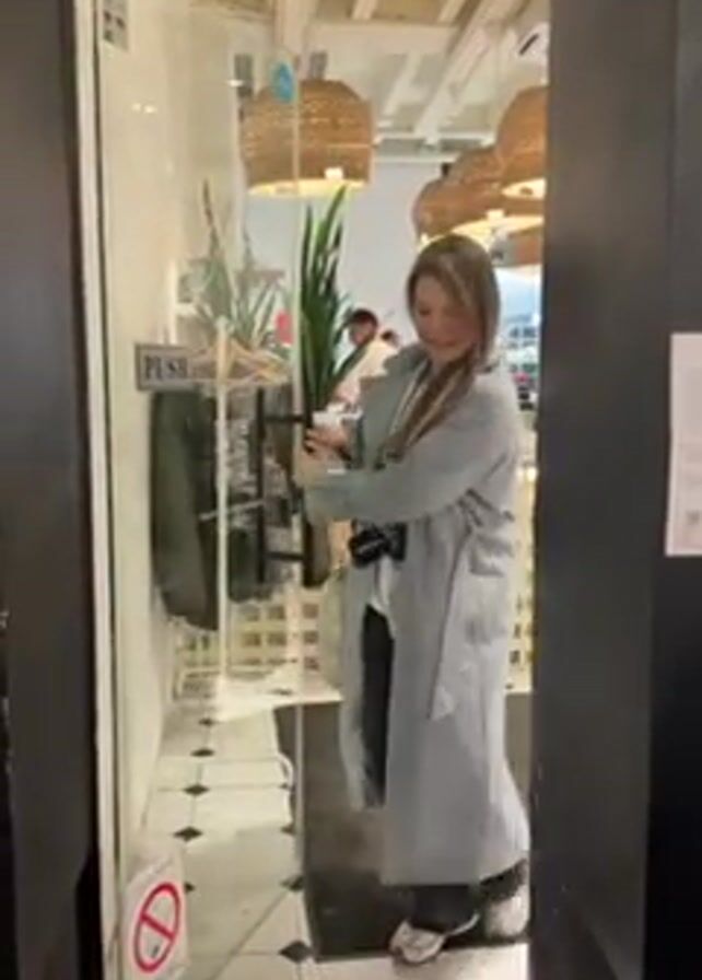 A young woman is pushing open a glass door and walking into frame. She is wearing a light blue trench coat over a white shirt and grey pants, and has a camera slung around her neck. The door has a "PUSH" sign and a "no smoking" symbol on it. Behind the door, the interior of a shop is visible, with plants, woven lampshades, and other merchandise. The floor inside is black and white checkered. The woman smiles and adjusts her hair as she enters the frame.