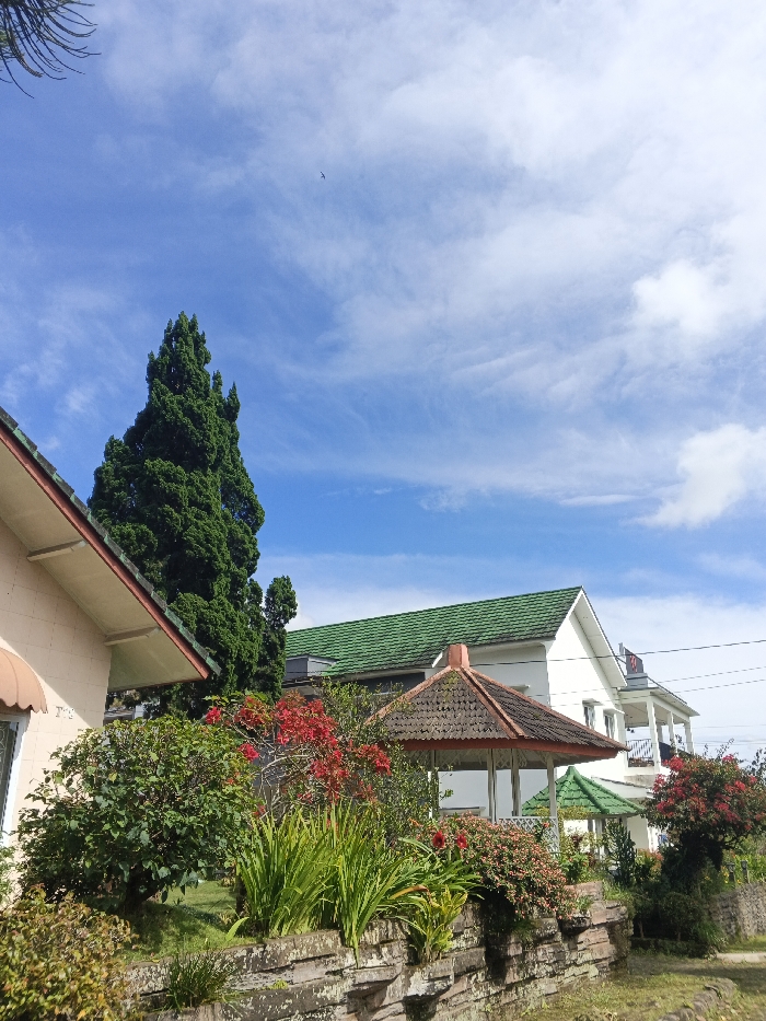 The image displays an outdoor daytime scene, identified as being in Đà Nẵng, Vietnam. The sky is clear blue with scattered white cirrus and cumulus clouds, and a single dark bird is in flight in the upper left quadrant. In the foreground, a low, layered stone retaining wall runs horizontally, supporting a garden area. This garden contains vibrant red flowering bushes, various green shrubs, and tall green grasses. To the immediate left, a portion of a light-colored building with a dark green roof edge and a light brown window awning is visible. A prominent, tall, dark green coniferous tree stands centrally, reaching into the upper portion of the sky. In the mid-ground, an octagonal gazebo with a reddish-brown tiled roof and white support pillars is situated within the garden. Behind the gazebo and extending to the right, a white multi-story building featuring a steep, bright green tiled roof and multiple balconies is present. Overhead utility lines are visible traversing the upper right section of the image. No individuals are depicted.