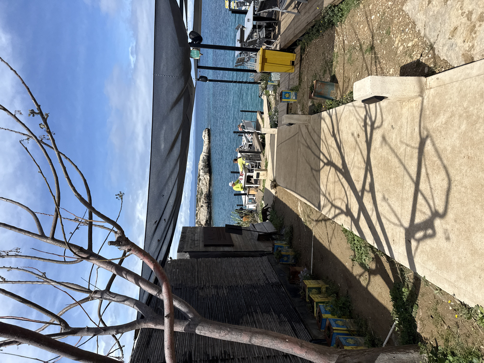 This image depicts a coastal outdoor dining area in Paralimni, Cyprus, under a partly cloudy blue sky. The scene is illuminated by direct sunlight, casting distinct shadows. In the left foreground, a bare, multi-branched tree stands, its trunk and branches appearing grey-brown, with some reddish undertones on the lower branches. Its shadows extend across a light-colored concrete pathway that leads into the scene. To the left of the pathway, a building with a dark, horizontal slatted facade is visible. Along its base, several repurposed, rectangular metal containers, painted yellow and blue, serve as planters for sparse vegetation. A black cat walks on the dirt ground between the planters and the pathway, moving towards the seating area. The concrete pathway transitions to a wooden deck area where a large, dark grey fabric canopy provides shade. Numerous square and rectangular tables with grey chairs are arranged on this decking, extending towards the sea. On the leftmost section of the deck, two individuals are seated at a table. One wears a white baseball cap and a bright yellow long-sleeved top; the other wears a light green top. At least two additional figures are partially visible at other tables further back. A prominent yellow industrial-style waste bin is positioned on the right side of the wooden deck. A smaller, integrated concrete waste receptacle is part of the concrete pathway on the far right. The background features the calm, turquoise-blue Mediterranean Sea. A rocky island or outcrop is visible in the mid-distance within the sea, and a faint silhouette of distant land or mountains lies on the horizon under the cloudy sky. Dark metal railings delineate the edge of the wooden deck overlooking the water. Another small animal, possibly a cat, is visible near the yellow bin on the wooden deck.