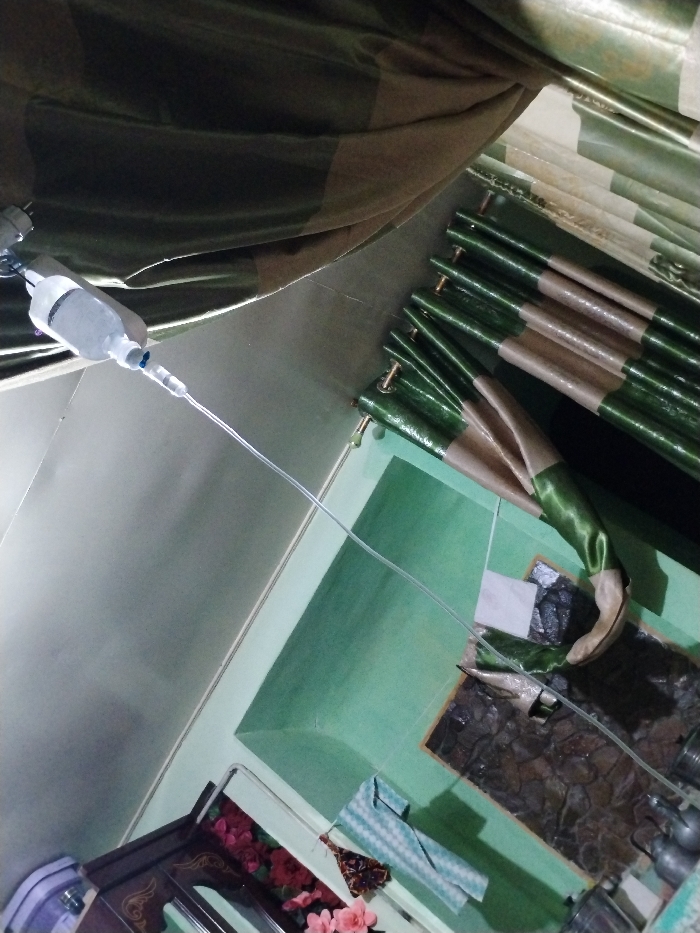 The image displays an indoor scene, likely a room within a residential or medical care environment. A white-covered intravenous (IV) fluid bag or bottle is suspended in the upper left, with a transparent plastic tube extending diagonally downward and to the right. Above this, a large section of draped, olive-green and beige striped fabric, possibly a curtain, is visible. To the right, a pleated curtain of identical green and beige striped fabric is affixed to a horizontal fixture. The walls exhibit a light green painted finish. Towards the bottom right, a segment of dark, textured patterned flooring or a mat is observed, bearing a small white rectangular object. In the lower left, a dark wooden cabinet featuring gold detailing and glass panels holds pink and red artificial flowers. Adjacent to the cabinet, a folded blue and white patterned cloth, several small metallic pots or containers, and a decorative object resembling a butterfly are present on a surface. No individuals are depicted. The visual information within the image does not contain identifiable geographical markers to confirm its location as Limbur, Uzbekistan.