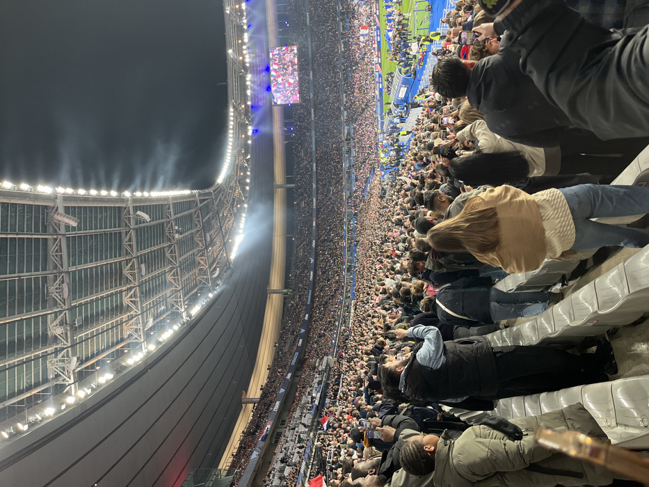 crowded stadium with a sea of people seated in rows of gray plastic chairs. The large metal structure of the stadium is visible above the crowd, with a massive screen positioned high up on the opposite side of the field. There is a large crowd standing on the green field, with a team of people in white uniforms standing by the sidelines. The crowd is mostly composed of adults and young adults, many of them wearing clothing associated with the colors of the French national team. There are several people in the foreground, including one person holding a cell phone. The image is taken from the lower level of the stadium, and the camera is looking towards the field. The location of this image is the Stade de France in Saint-Denis, France (latitude: 48.924, longitude: 2.36). The image captures the scene of a soccer game in progress.