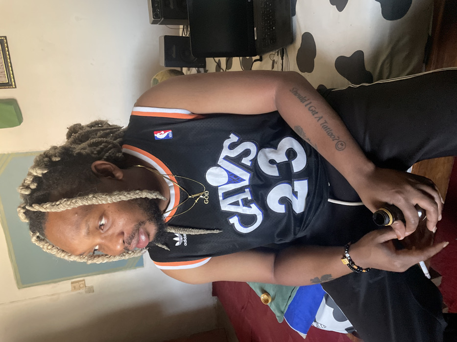 A male subject with dark skin and light-colored dreadlocks, featuring an undercut, is seated indoors. He wears a black sleeveless NBA "CAVS 23" jersey with orange and white trim, black athletic pants, two gold-colored necklaces (one with a cross pendant, one with "GOD"), a gold ear piercing, two beaded bracelets (one black and white, one with a prominent gold rectangular bead), and a gold ring on his left hand. A tattoo reading "Should I Get A Tattoo?" followed by a symbol is present on his left forearm. He is looking to the viewer's left, holding an uncapped brown glass bottle in his clasped hands, with a lit cigarette held between his fingers. The subject is seated on a white surface with black spots (cow print), likely a bed or sofa cover. A red carpet or rug is visible on the floor to the left. To the subject's left, on a blue and white patterned pillow, a small golden circular dish and green fabric are present. To his right, a black laptop and two black speakers are situated on the spotted surface. The background features light-colored walls, with a dark-framed picture and a green object mounted on the wall. A light blue-green rectangular shape is visible on the upper left wall. No specific visual markers within the image definitively identify the location as Jos, Nigeria.