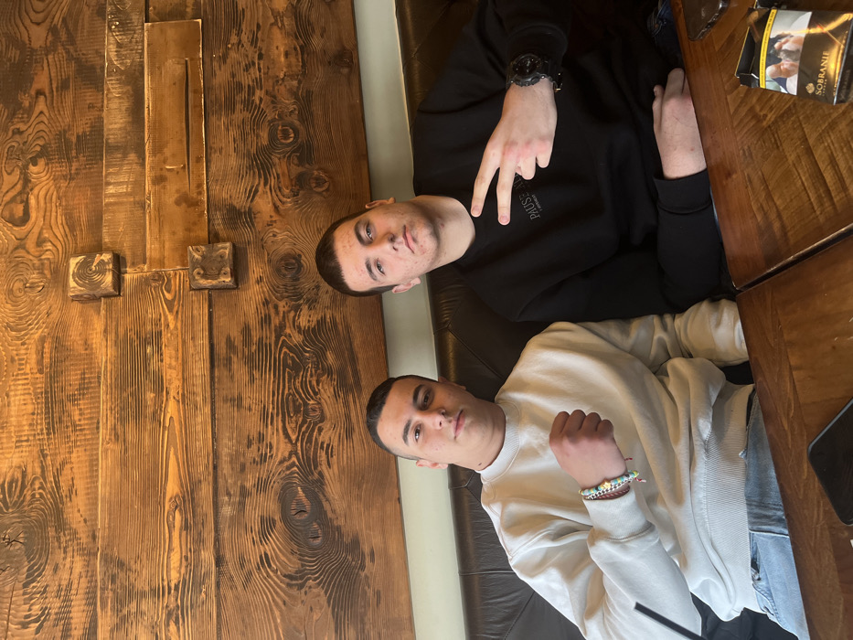 Two young adult males are seated side-by-side at a wooden table in an indoor establishment