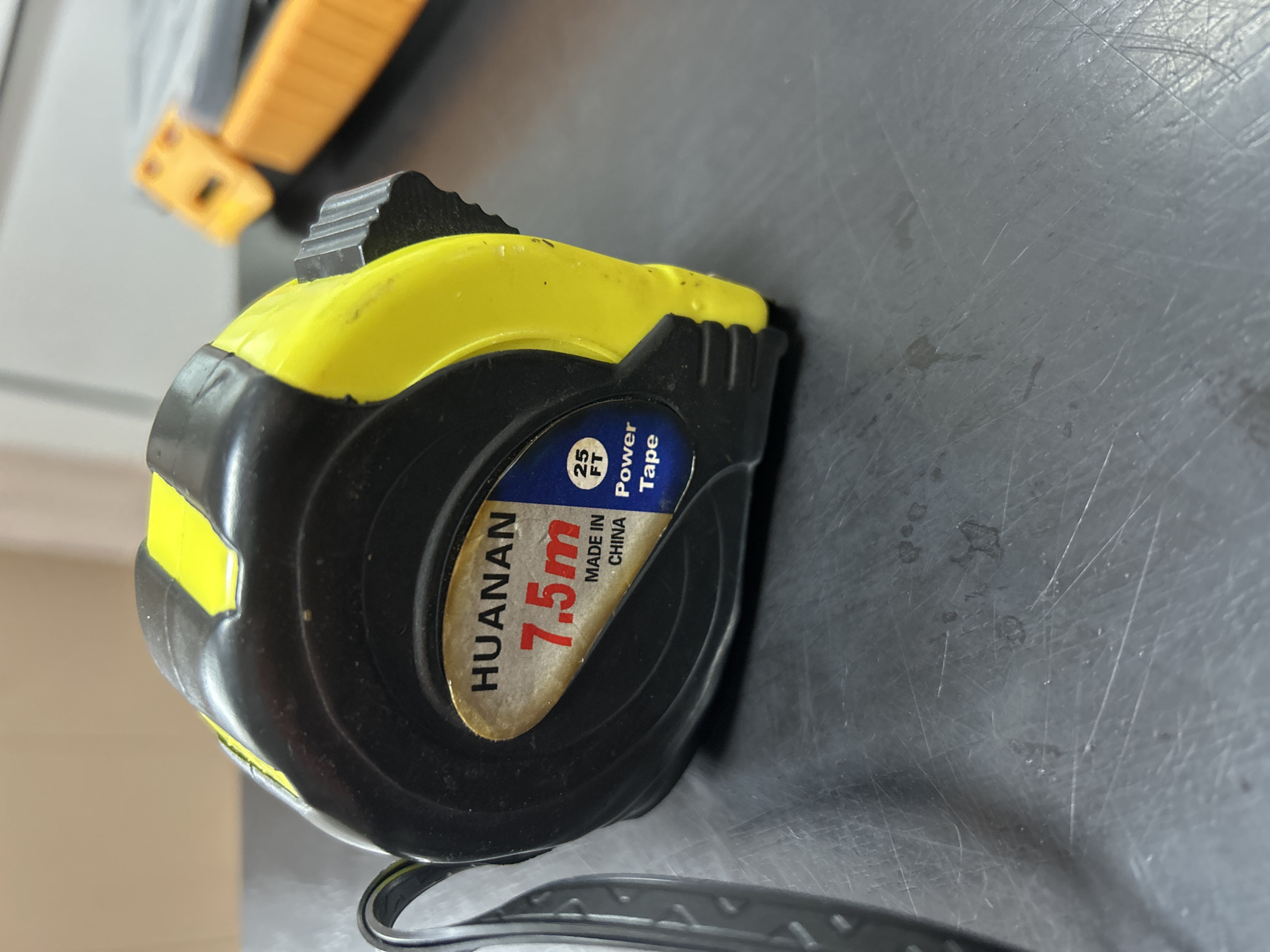A yellow and black "HUANAN Power Tape" measuring tape with a length of 7