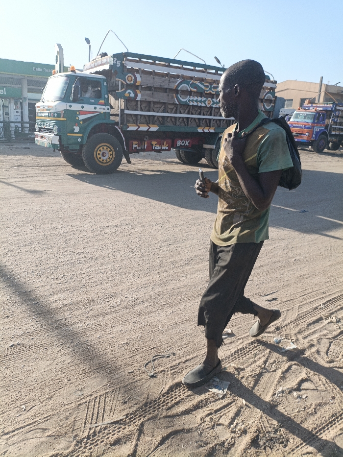 A man walks on a dusty, sandy road. He wears a green t-shirt, dark pants, and dark shoes, carrying a backpack. In the background, two large trucks, one green with decorative painting and the other blue and orange, are parked near a building with a green sign. The scene is bathed in sunlight.