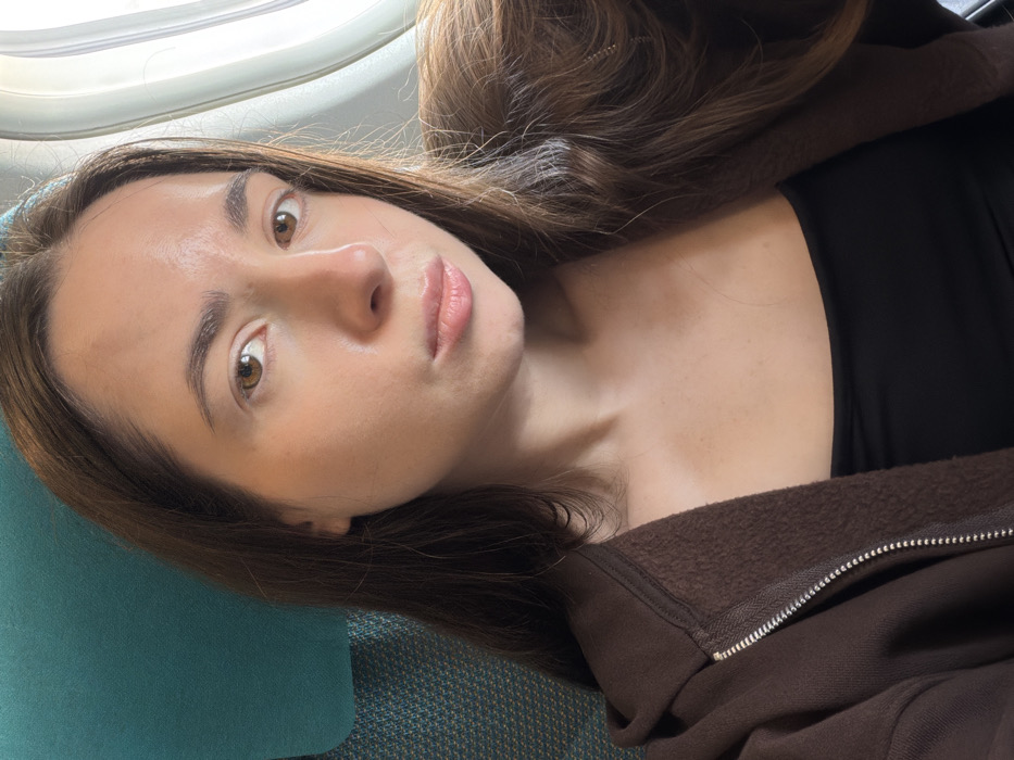 The image displays a head and torso shot of an adult female within the cabin of a commercial aircraft. The subject has long, dark brown hair, a fair complexion, and light brown eyes. She wears a dark brown zippered hoodie over a black top and maintains a neutral expression, looking directly into the camera with slightly parted lips. To the left of the frame, a teal-colored airplane seat headrest is visible. To the right, an airplane window is present, allowing bright natural light into the cabin. The scene depicts an individual in transit, consistent with air travel. While the specific city of Kuta, Indonesia, is indicated as a contextual location, the visual evidence within the image itself does not depict any elements of Kuta; rather, it shows the subject in an aircraft cabin, presumably en route to or from Kuta.