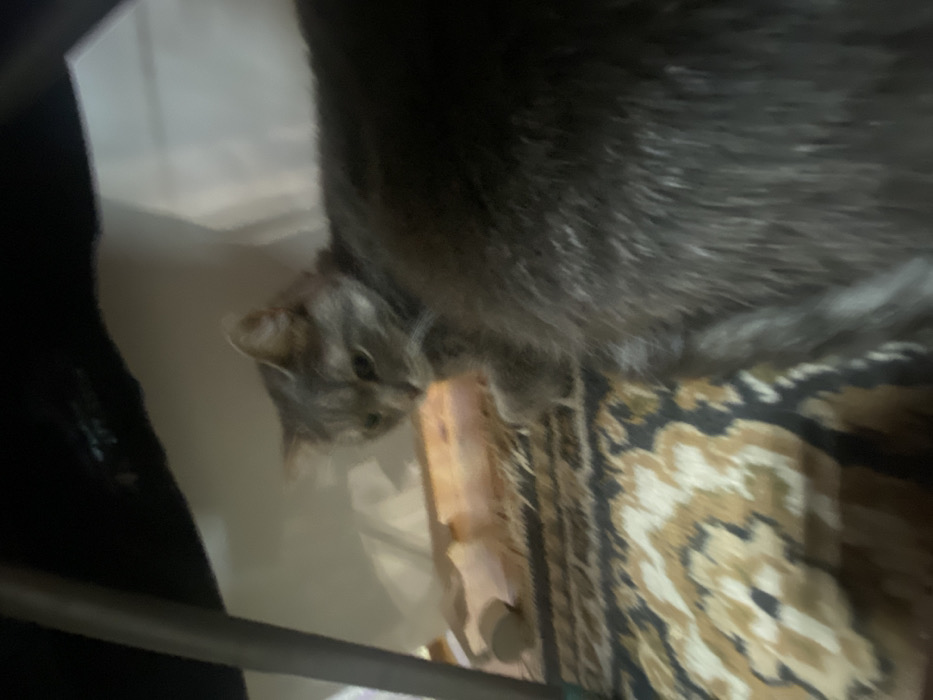 A gray tabby cat is depicted indoors, sitting on a patterned rug in Прикамский, Russia. The cat's head is turned slightly to its left, looking downwards. Its body is partially blurred. The rug features a repeating pattern of gold/tan and dark brown/black shapes. In the background, under a dark, obscured object, possibly furniture, are various light-colored items, including what appears to be straw or bedding material. A vertical pole, consistent with a furniture leg, is visible on the left side of the frame. The lighting is dim and diffuse. No people are present.