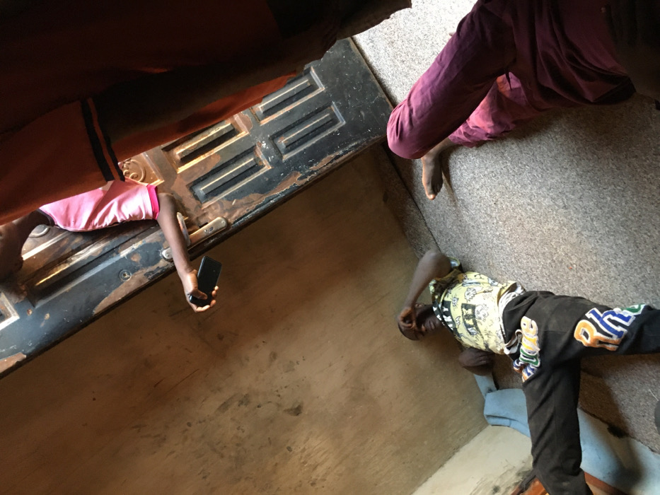 The image depicts an indoor scene in Bukuru, Nigeria, involving three individuals within a confined space. The floor is covered with a grey, speckled textile surface. A light brown, possibly plastered wall is visible on the left. A dark, weathered wooden door with recessed rectangular panels and a metallic handle is positioned diagonally across the upper right quadrant of the frame. In the foreground on the right, the lower body of an individual is visible, wearing dark reddish-purple pants. Bare feet are present on the grey floor. On the left side of the frame, a male individual is lying on his back on the grey floor, with his head positioned against the light brown wall. He is wearing a light-colored t-shirt with dark graphics and dark pants featuring colorful lettering on the right leg. His right arm is bent with his hand near his face, appearing to shield his eyes. His left leg is bent. Emerging from behind the dark doorframe in the upper central portion of the image, the arm and upper torso of a third individual are visible. This individual wears a pink short-sleeved shirt with a darker trim. The arm extends forward, holding a black smartphone horizontally. To the immediate right of this individual, a portion of a fourth individual, wearing a reddish-orange garment, is partially visible. The individual holding the phone appears to be standing at or just inside the doorway.
