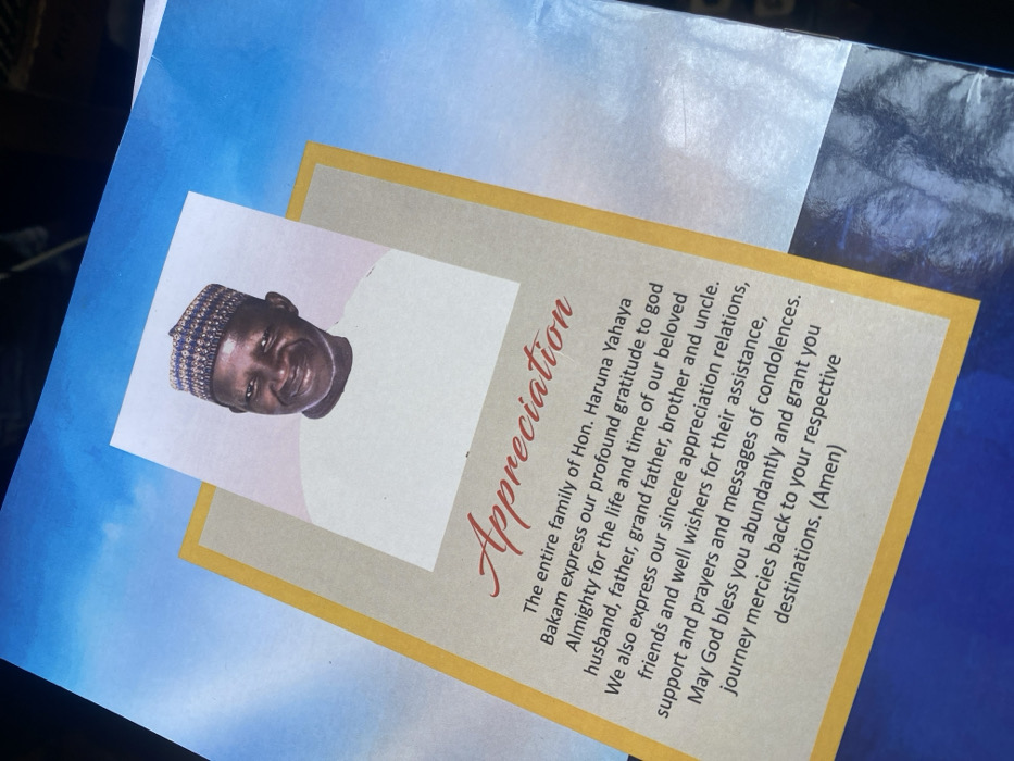 The image displays a printed "Appreciation" card or leaflet, presented at a slight angle on an unidentifiable dark surface, in the city of Television, Nigeria. The card features a central, light-beige rectangular panel with a yellow border. At the top of this panel is a portrait photograph of an elderly dark-skinned male, identified by the text as Hon. Haruna Yahaya Bakam. He is smiling faintly, wearing a light-colored traditional garment and a patterned cap. Below the photograph, the word "Appreciation" is written in a stylized red script font. Further down, a block of black text, originating from "The entire family of Hon. Haruna Yahaya Bakam," expresses profound gratitude to God for his life and time, and sincere appreciation to relations, friends, and well-wishers for their assistance, support, prayers, and condolences, concluding with a blessing and "Amen." The background of the card, extending beyond the beige panel, is a light blue with subtle white, cloud-like patterns.