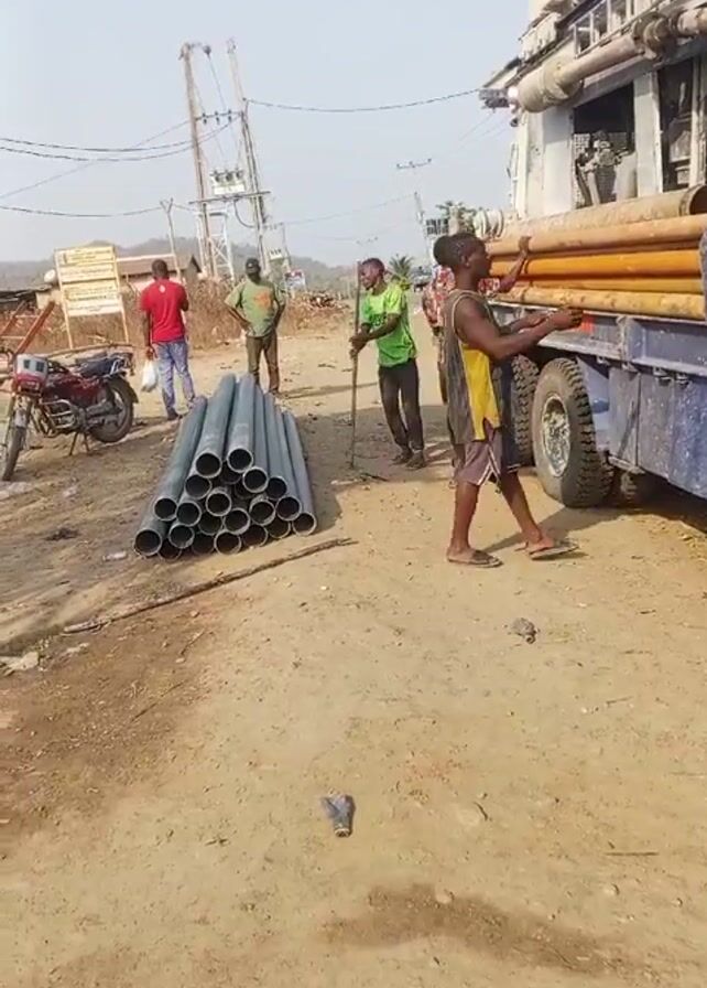 group of men working near a drilling rig. The rig is mounted on a blue truck and has several pipes attached to its side. One man is standing on the truck, apparently unloading pipes. Another man is walking toward the truck with a long stick. Several other men stand nearby watching. A pile of gray pipes is on the ground, and a motorcycle is parked near them. The ground is dirt and gravel. In the background is a utility pole and some trees. The sky is clear.