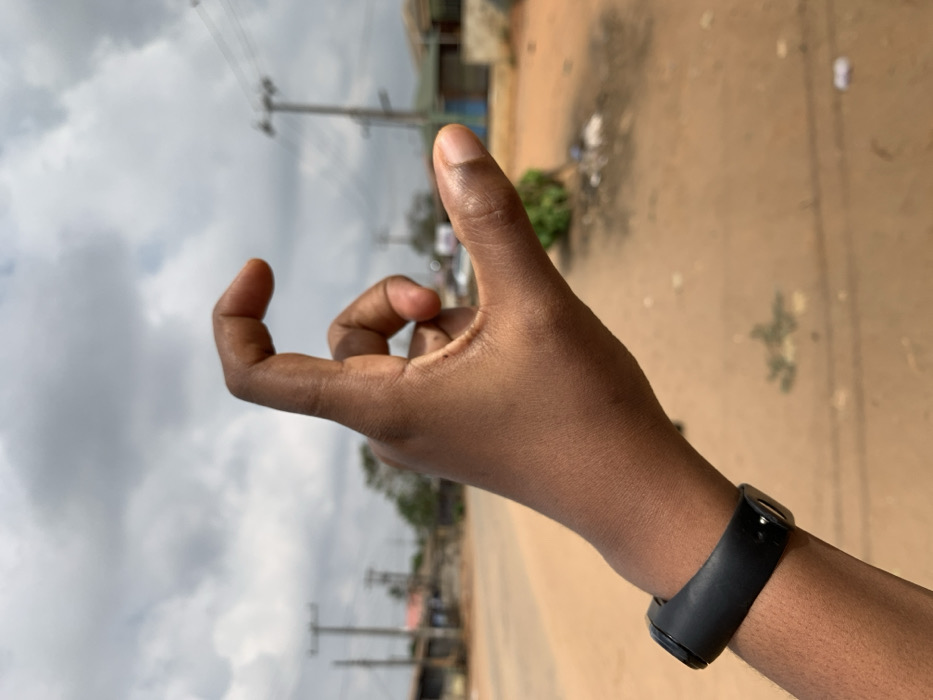 A dark-skinned left hand, wearing a black wristband, is centrally positioned and in sharp focus, performing a pinching or "C" gesture with its index finger and thumb while the other fingers are curled