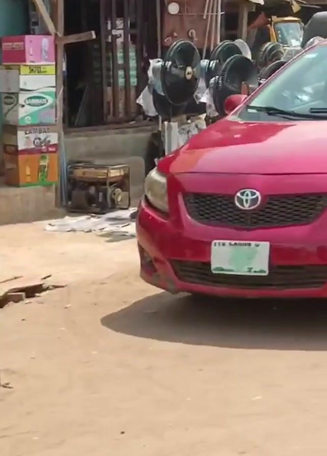 street scene in what appears to be a busy market or commercial area, likely in an African country. Initially, two people are seen next to a motorcycle; a woman is steadying a box being placed on it by a man. Various other vehicles including a red car, auto rickshaws and a black SUV pass by in the background, suggesting the presence of active transportation. The surroundings feature modest shops and buildings. The overall impression suggests a lower-income setting with people engaging in commerce and daily activities.