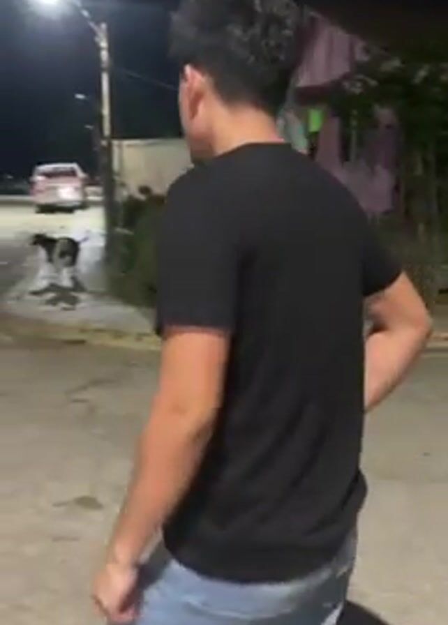At night, a young man stands on an empty street with arms outstretched, seemingly mimicking or beckoning two dogs in the distance