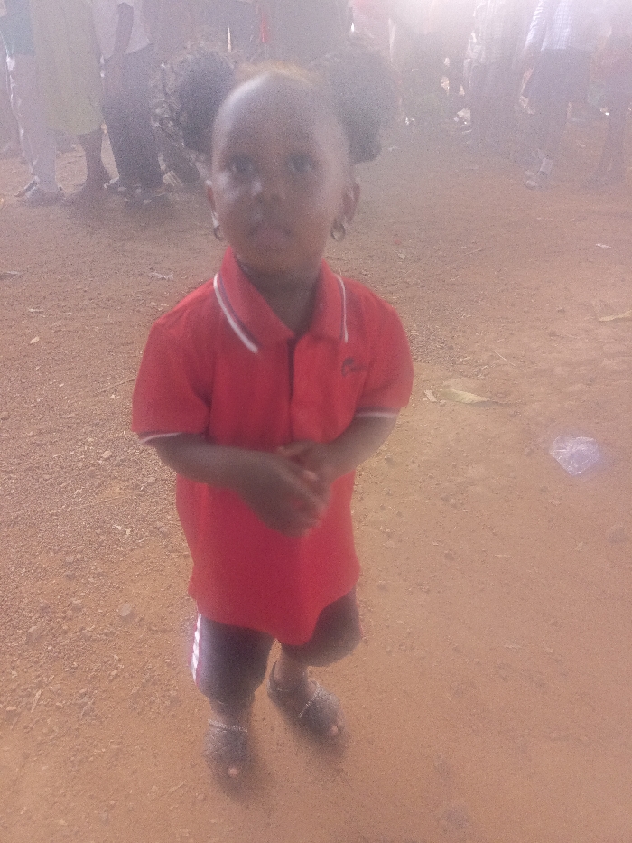 A young child stands in a dusty area wearing a red polo shirt, dark shorts with a white stripe, and sandals. The child has earrings and hair styled in two large puffs. The background is hazy with several people visible, suggesting a gathering or event. The ground appears to be dry dirt or reddish soil. A piece of litter is visible on the ground to the right of the child.