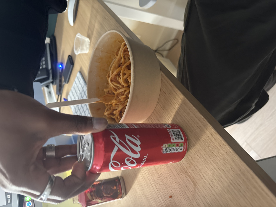 A close-up, eye-level indoor shot depicts a person's right hand gripping a red Coca-Cola Original can on a light wood-grain desk. The can features French nutritional information and a "SCANNEZ-MOI" QR code, indicating its intended market is France. The person's hand wears a plain silver band on the ring finger and a wider, textured silver ring on the middle finger. To the right of the can, a light brown, circular disposable bowl holds spaghetti with a red sauce, with a wooden fork inserted. A small, clear plastic cup is positioned further right on the desk. The background reveals an office-like setting with a white computer keyboard, a black electronic device emitting a blue light, and a partial view of a white computer mouse. A red-tinted decorative item or container with an image of a character is situated to the left of the Coca-Cola can. The person's lap, clad in dark fabric, is visible beneath the desk, above a light-colored floor. The scene takes place in an indeterminate indoor location within France, evidenced by the French text on the Coca-Cola can; no specific landmarks pinpointing Paris are visible.