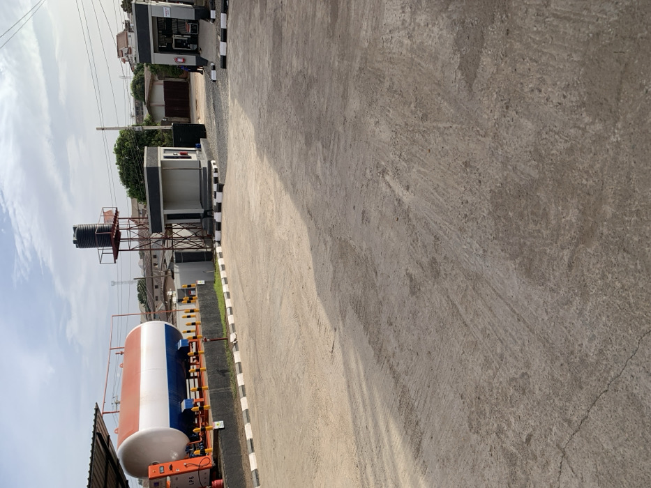 An outdoor liquefied petroleum gas (LPG) filling station is depicted in the city of Gwong, Nigeria, under a partly cloudy sky
