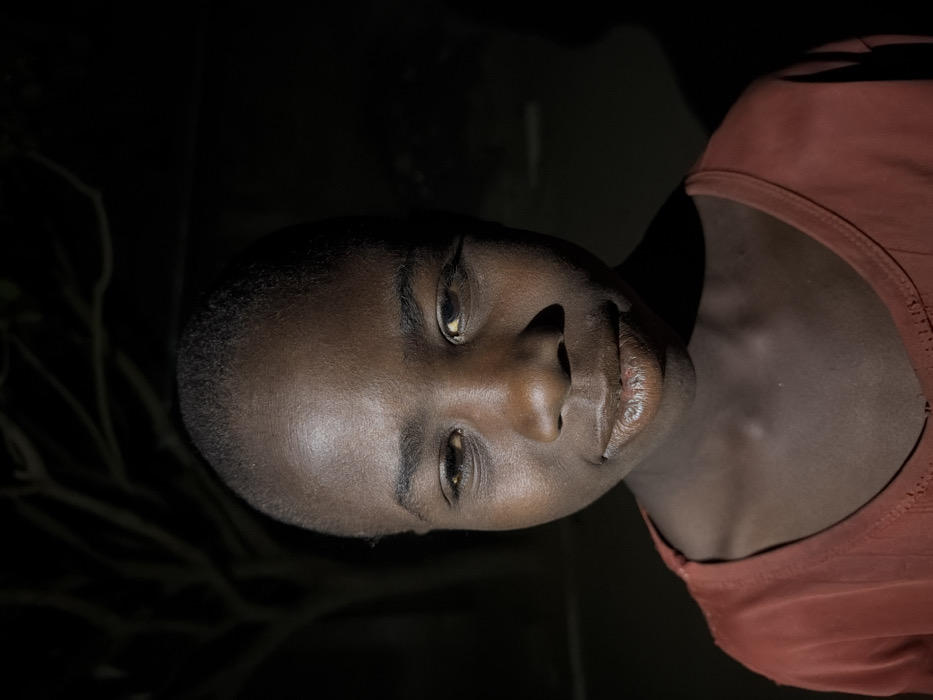 An individual, appearing to be a young child, is depicted in a medium close-up, illuminated by an off-camera light source creating shadows on the left side of their face. The subject has dark skin, short dark hair, and is looking directly at the viewer with a slight, closed-mouth smile. Their lips show some texture and a lighter tone. The child is wearing a reddish-brown garment with a round neckline. The background is dark and out of focus, revealing the bare branches of a tree against an otherwise indistinct dark environment. The scene takes place in Gandu Albasa, Nigeria. No other individuals or explicit actions are visible.