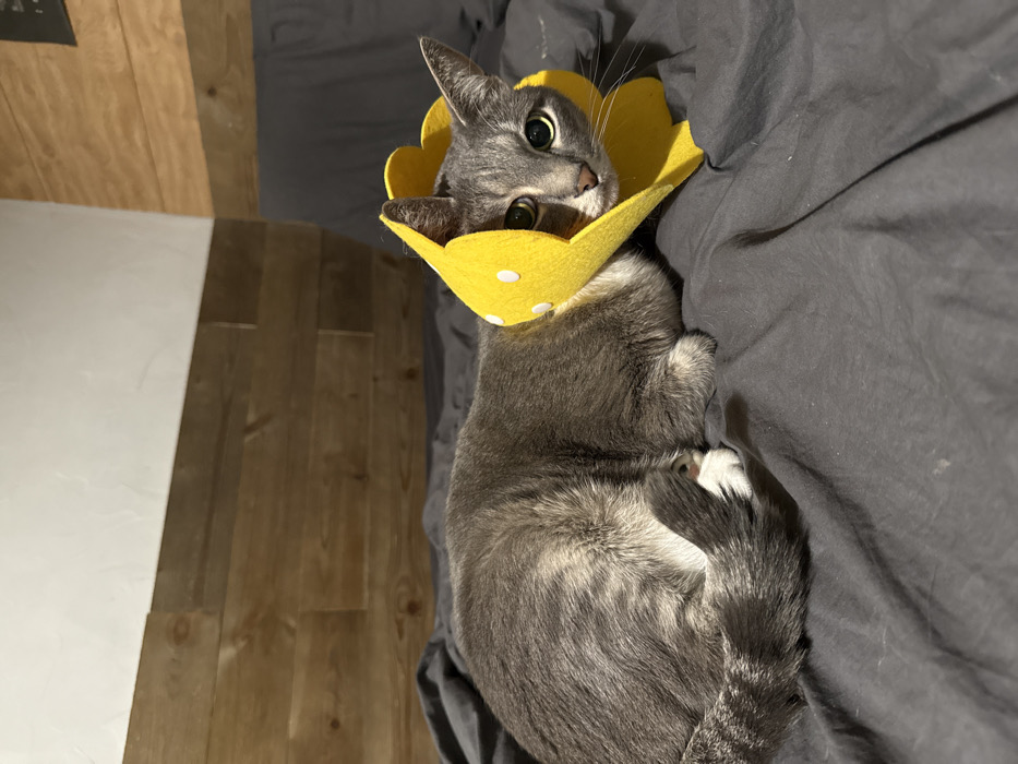 - "A gray tabby cat wearing a yellow flower-shaped Elizabethan collar with white polka dots rests on dark gray bedding" by FM-m5rDi1, licensed under CC BY 4.0